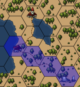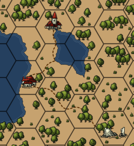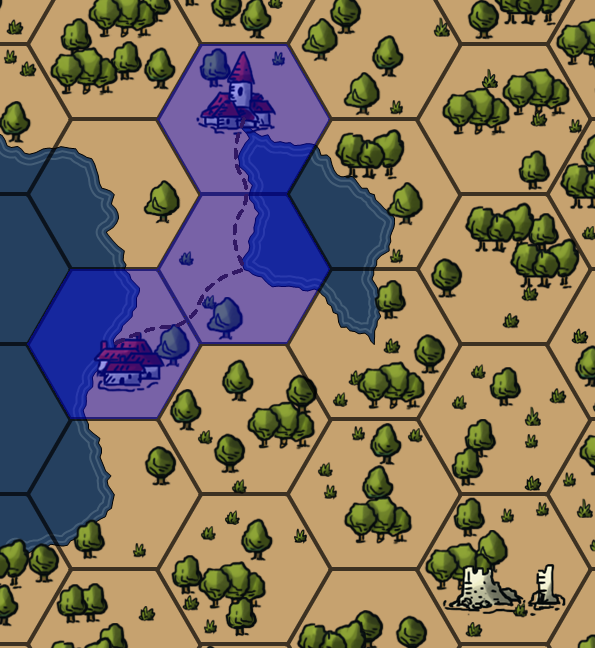 I want a road connecting my locations and I want it to go through the hex grid tiles so it’s easy to move characters along it. I change the snap mode to “Snap Center” and click on the tile I want the road to start in. When I move my cursor to my second town, the road snaps to the center of each grid along the way and the snap highlights each grid. I click to place the point and then click the tile with the ruins and then right click to finish the road.